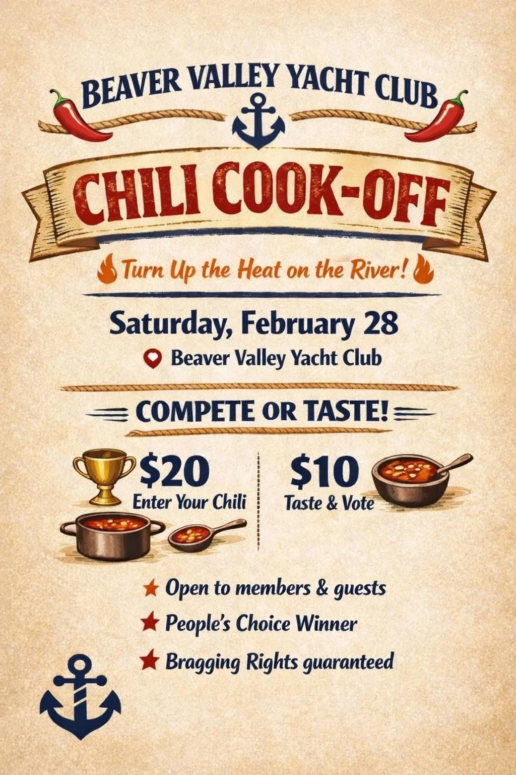 Send us an email at BeaverValleyYachtClub@gmail.com to enter, with your name and phone number.